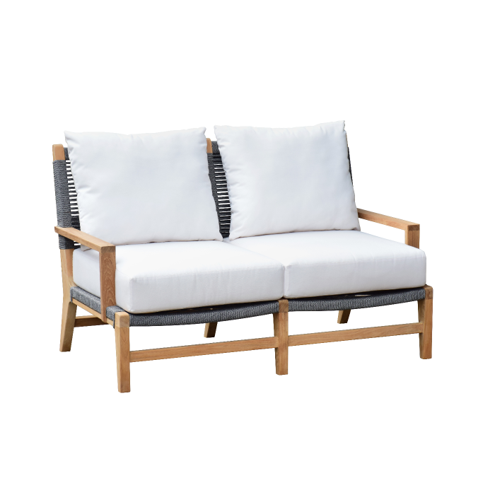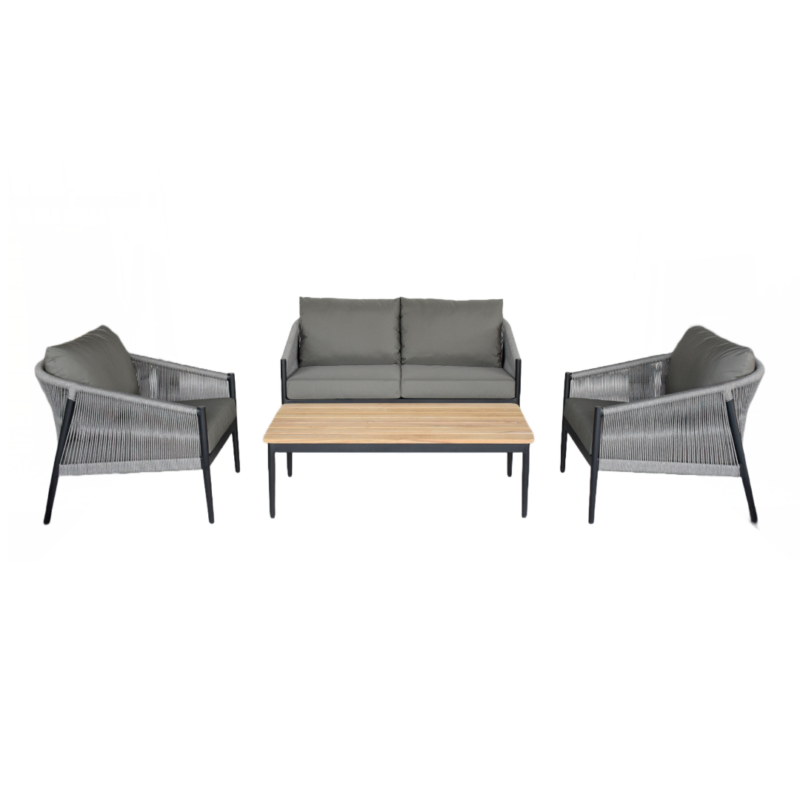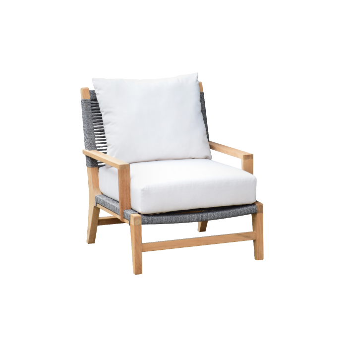 The set’s synthetic rope construction ensures durability and weather resistance, making it perfect for outdoor living. The combination of white upholstery, teakwood accents, and gray braid detailing creates a fresh and inviting ambiance.