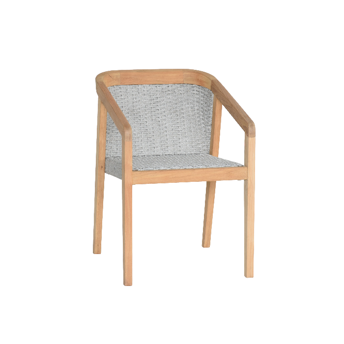 Crafted from premium-grade teak wood, the chair’s frame boasts a warm, natural grain that complements the gray tones of the rope, adding a subtle yet elegant contrast. The combination of teak wood and all-weather rope is not only visually appealing but also highly functional, providing durability and weather resistance for both indoor and outdoor dining spaces. Teak wood is known for its strength and resilience, and the expertly woven rope further enhances this dining chair’s appeal by offering both support and a comfortable seating experience.