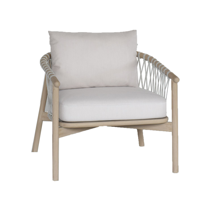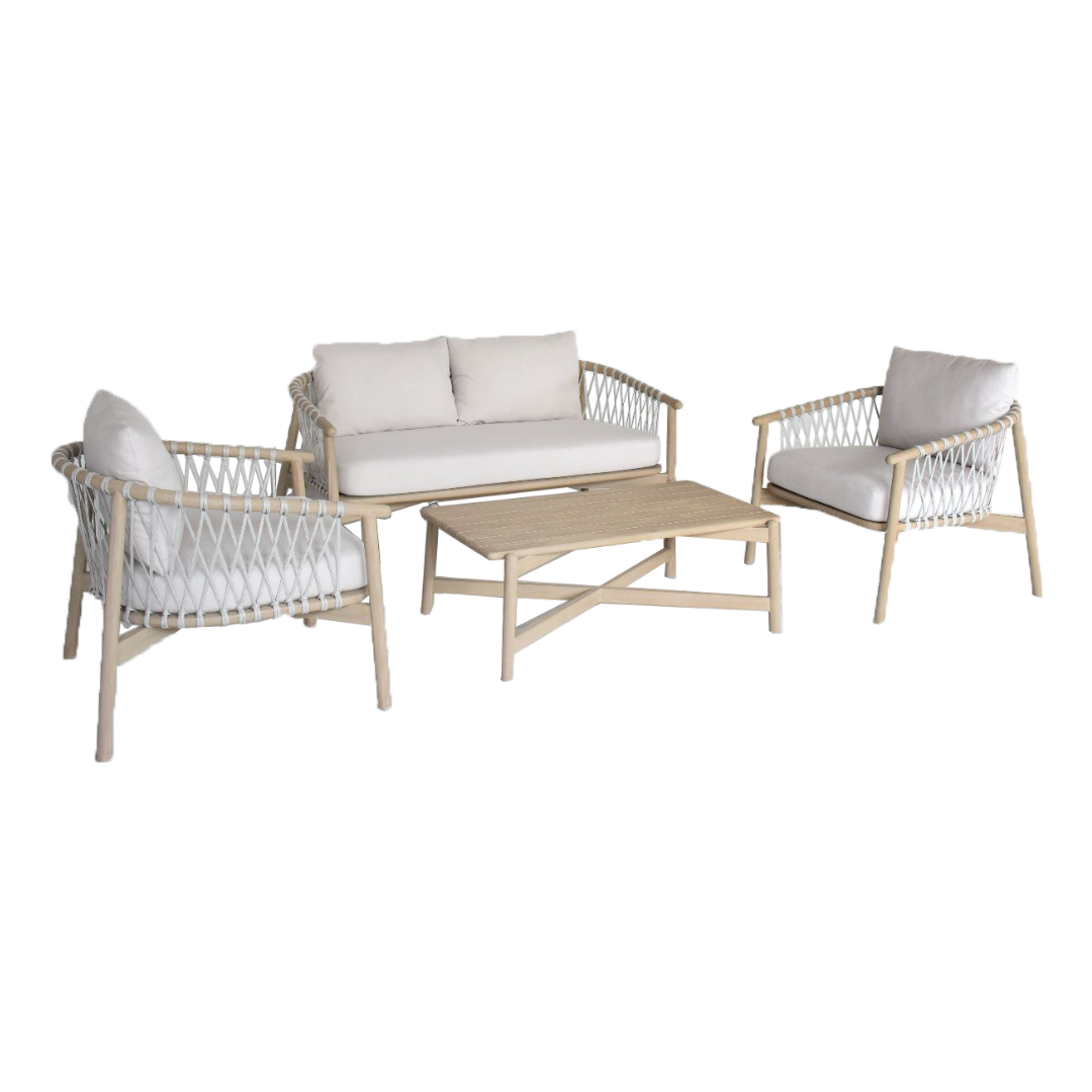 The Colmer Sofa Set is made from a combination of high-quality materials to ensure both aesthetic appeal and long-lasting durability. The table and settee are made from teakwood, renowned for its rich, warm tones and natural beauty. The sides of the sofa and chairs are wrapped in durable synthetic rope, adding texture and a modern touch to the overall design. The cushions are made with Sunproof Ateja fabric in a soft, light gray-washed finish, creating a cool and calming vibe that complements any space. The combination of light tones and natural materials makes this set not only incredibly comfortable but also visually striking, perfect for those who want to add a bit of tropical charm to their villa, home, or outdoor space.