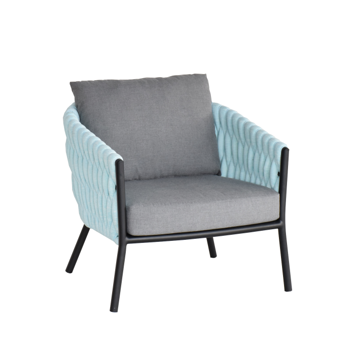 The set is crafted with premium materials to ensure both comfort and durability. The coffee table and settee are made from high-quality teakwood, providing a warm, natural touch that complements the overall design. The unique side of the sofa is made from a soft synthetic sock material, which gives the set a luxurious feel and enhances its comfort. Paired with powder-coated aluminum frames, the lounge and settee offer a perfect balance of strength and style. The cushions are made from Ateja Sunproof fabric, ensuring that they stay vibrant and comfortable, even under the sun. The soft light gray cushions, light blue side design, and black settee combine to create a refreshing, modern aesthetic that’s both inviting and soothing.