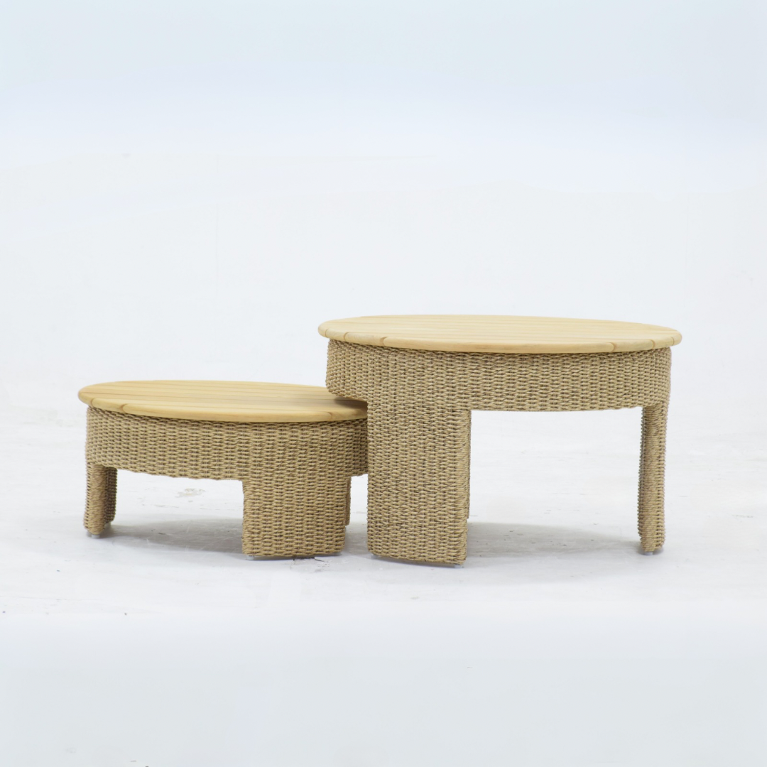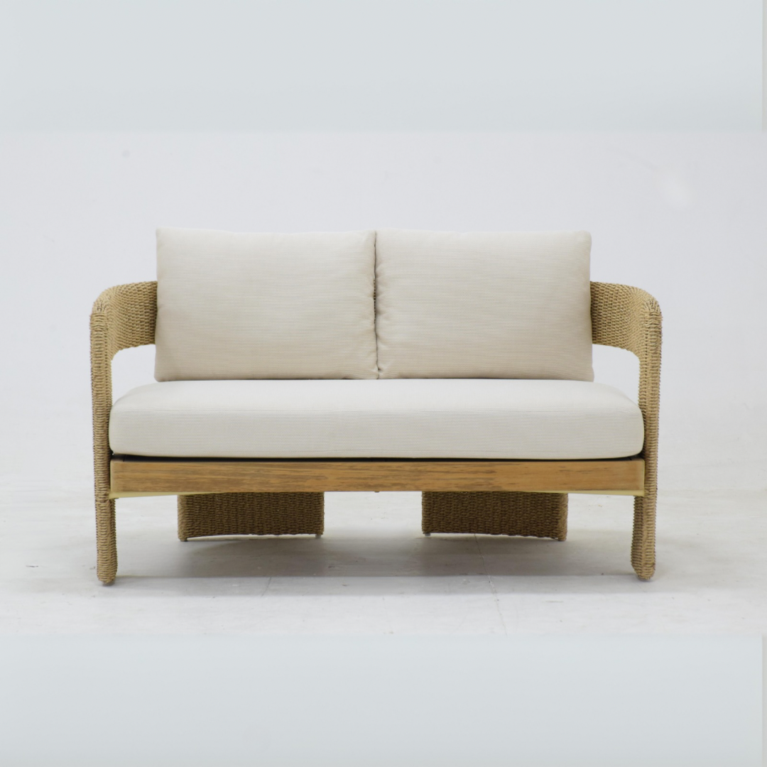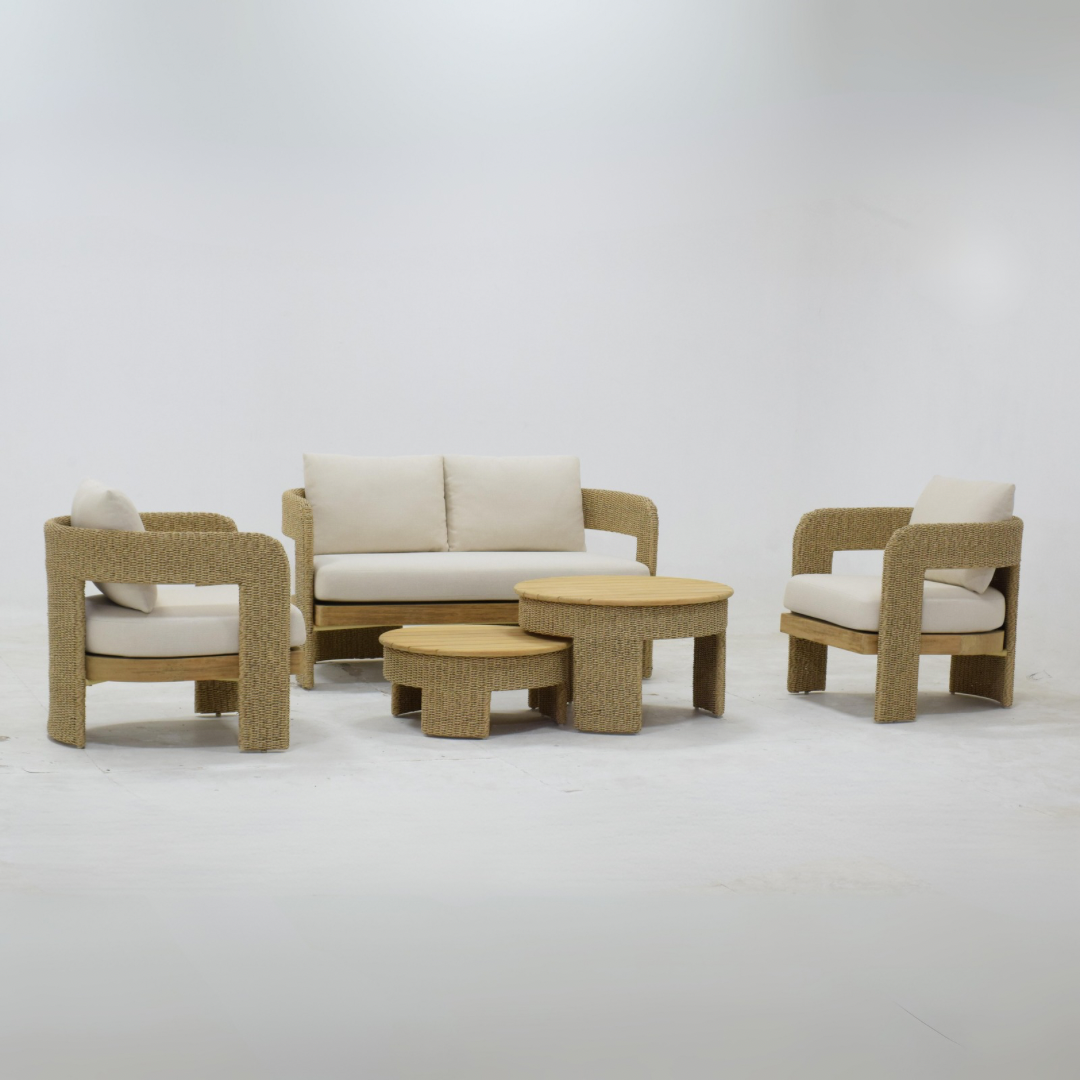 Constructed with solid teakwood and intricately woven twist rope, this sofa set combines durability with beauty. The Ateja Sunproof cushions in beige offer ultimate comfort, making it an inviting spot to sit, whether you’re chatting with friends, working, or simply unwinding. The color palette—semi-olive and brown for the frame and beige cushions—creates a harmonious look that is both calming and sophisticated. The unique twist and teakwood table completes the set, adding an element of rustic elegance that blends seamlessly with the modern appeal of the sofa.