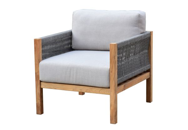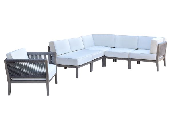 Constructed with high-quality materials, the Paris Sofa Set features a sturdy frame made from brown-finished teakwood, known for its strength and natural beauty. The body of the chairs is wrapped in durable gray all-weather rope, adding texture and a contemporary edge while ensuring long-lasting use, whether indoors or outdoors. The cushions, made from Ateja Sunproof fabric, are a soft light gray, providing a serene and inviting atmosphere. Their plush softness makes the set incredibly comfortable, perfect for lounging or entertaining guests. The brown teakwood legs and frame complement the light gray cushions, creating a harmonious, neutral palette that blends effortlessly with any décor.