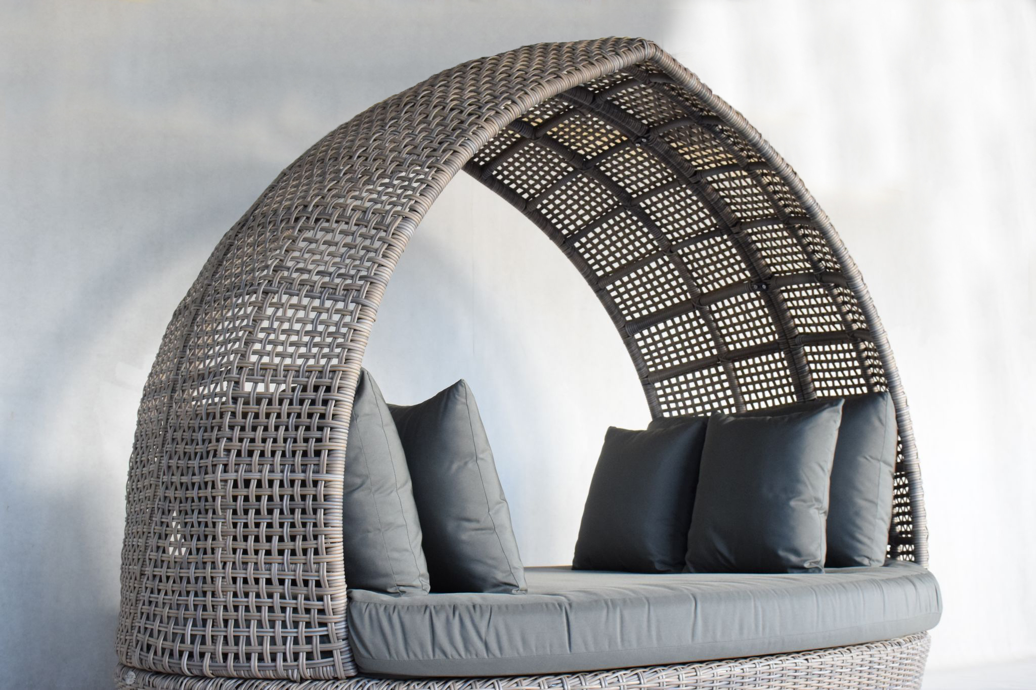 Introducing the Sandy Bay Daybed, a stunning piece from Latif Living, crafted with care in Kediri, East Java. This daybed is the perfect fusion of form and function, designed to elevate your outdoor experience. With its unique, modern design, it features a charming rooftop that offers ample shade, protecting you from the sun while you lounge in style. The combination of a powder-coated aluminum frame and wicker round core creates a light, fresh look, evoking the relaxed vibe of Bali. The soft, light gray cushions add an air of serenity and sophistication, making it an ideal addition to any luxury villa or private poolside.