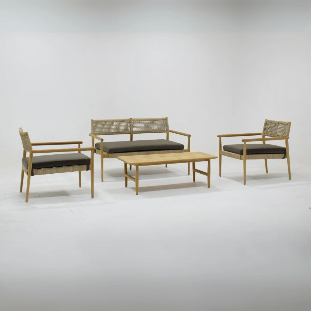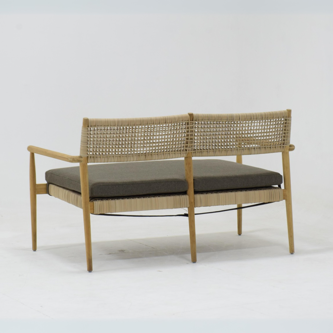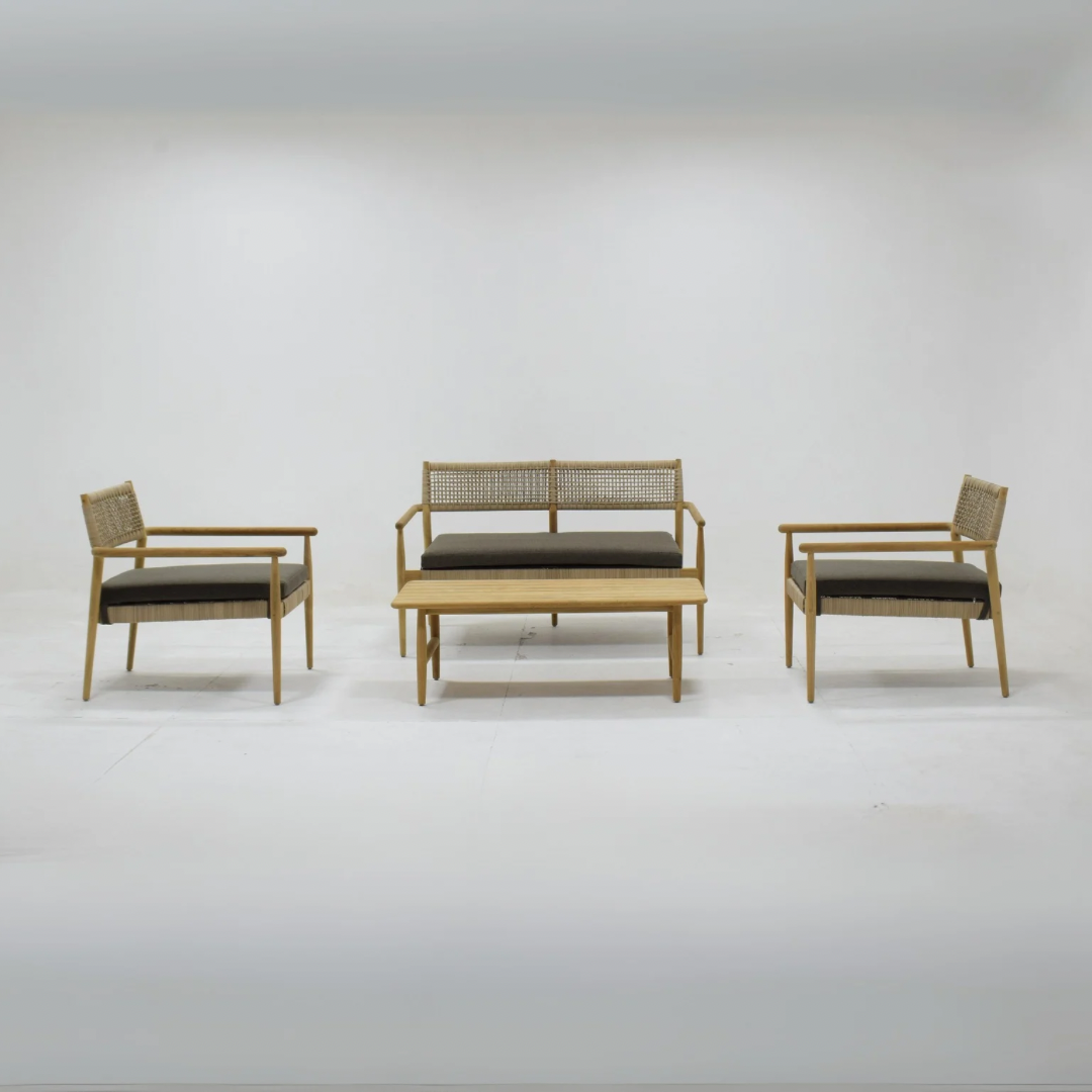 Crafted from fine sanded solid teakwood and round core wicker, the body of the sofa, including the armrests and legs, exudes a natural, organic charm while providing exceptional strength. The cushions, made from Ateja sunproof fabric, are 5 cm thick, ensuring a plush, cozy seating experience that is as comfortable as it is durable. The browny rope color of the body, paired with the olive semi-gray cushions, creates a harmonious and earthy color palette that brings a sense of tranquility to any space. Whether you’re enjoying a cup of coffee in the morning or hosting a lively conversation, the Sardinia Sofa Set 2 offers a relaxed and stylish environment.