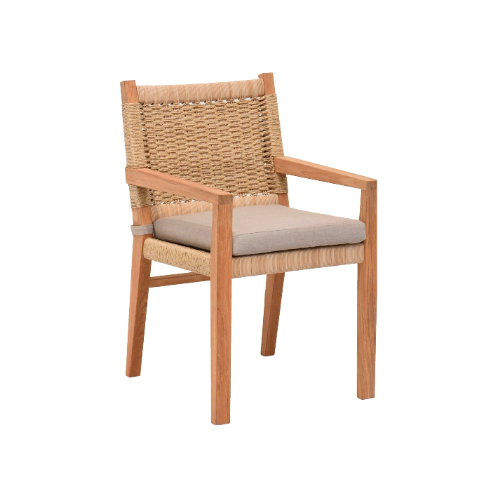 The Victoria Dining Chair from Latif Living is a stunning piece inspired by the modern charm and sophistication of Victoria, Australia. Proudly manufactured in Kediri, East Java, Indonesia, this chair exudes both comfort and style with its thoughtful design and premium materials. As the sibling of the Victoria Side Chair, the Victoria Dining Chair adds an extra touch of versatility with its armrests, providing a more relaxed, supportive seating experience. The intricate twisted wicker used for the backrest and seat pad creates a unique aesthetic, while the durable teakwood legs and Ateja sunproof cushion ensure lasting strength and comfort.